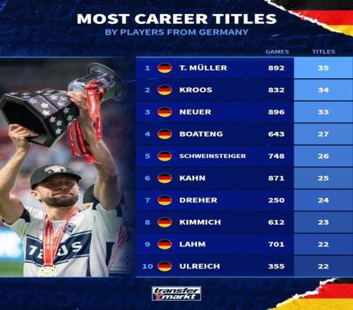 在跟随温哥华白浪夺得加拿大冠军联盟冠军后,托马斯-穆勒职业生涯已夺得35座冠军,这使得他超过托尼-克罗斯,成为夺冠次数最多的德国球员。