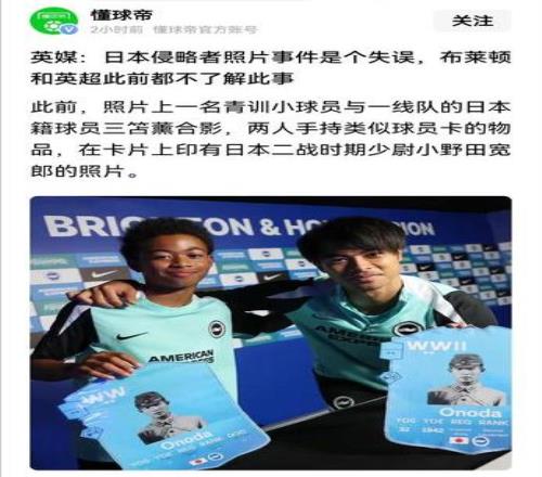 日本国脚三笘薫在英超公开活动上,手持二战“战犯”照片合影的事情,已经在全球球迷圈中发酵了,这件事情对英超也产生了全球范围内的负面影响,英超球队布莱顿已经公开道歉,并表示俱乐部和英超联赛对此事均不知情。