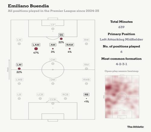 埃梅里的进攻阵型通常以两名内收的10号位球员在防线间活动为特征,边锋也常常扮演隐蔽的第二组织者角色,而非紧抱边线。布恩迪亚在这些中路空当如鱼得水,同时也能与靠近边线的边后卫进行良好配合。