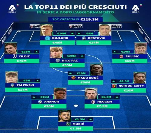 北京时间10月9日,在更新了意甲球员的身价之后,德转还列出了此次身价上涨幅度最高的11人阵容,霍伊伦、凯南-伊尔迪兹、尼科-帕斯、普利希奇、夸迪奥-科内以及扎莱夫斯基入选。德